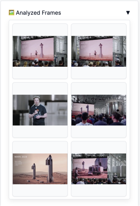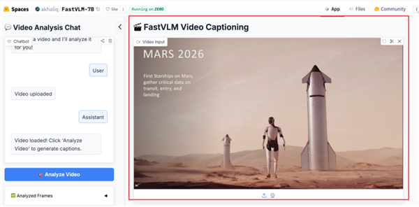 我們同樣上手體驗了FastVLM的強大功能。我們選取了近期在社交媒體上廣為流傳的“馬斯克計劃將擎天柱(Optimus)機器人送上火星”的視頻作為測試材料。整個過程非常直觀,上傳視頻后,只需點擊左側的“Analyze Video”,分析就開始了: