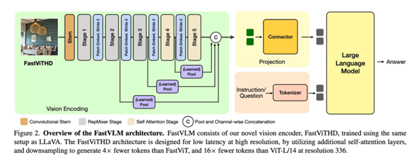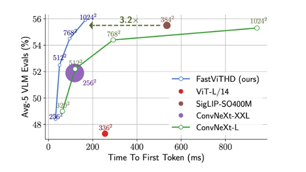 FastVLM之所以能實現速度與性能的平衡,其技術核心在于一種新型的混合視覺編碼器 FastViTHD。從技術角度看,這種編碼器能夠輸出更少的 token,并顯著縮短高分辨率圖像的編碼時間。