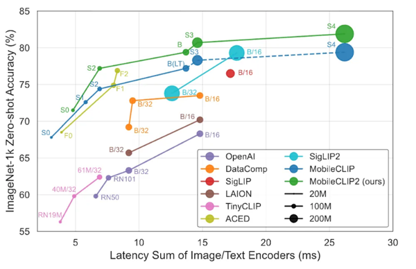 其次,FastVLM的開源并非一次孤立的技術展示,而是蘋果為其“端側AI”戰略精心打造的關鍵一環。與FastVLM一同引發關注的,還有蘋果最新開源的另一類兼顧低延遲與高準確度的圖像-文本模型 MobileCLIP2。